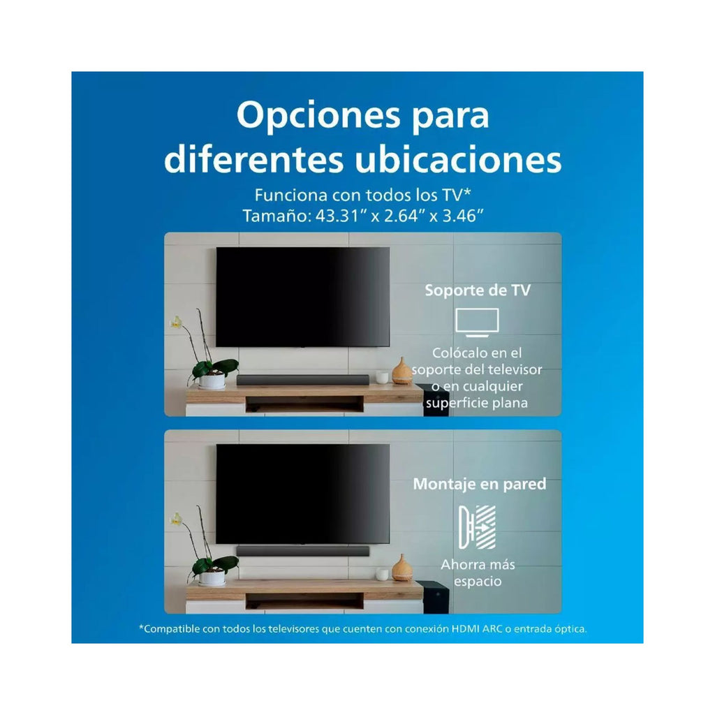 La Philips TAB4208 ofrece un sonido claro y envolvente con 2 canales y 60W de potencia (30W RMS), ideal para películas, música y series.